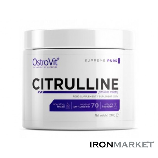 OstroVit Citrulline спортивная пищевая добавка, ее основа цитруллин малат, обогащенный таурином и витамином В6. Цитруллин в сочетании с яблочной кислотой является наиболее эффективной формой данной аминокислоты. Яблочная кислота в свою очередь, улучшает действие и усвояемость цитруллина. Несомненно, одним из важнейших эффектов использования OstroVit цитруллина, является увеличение производительности, ускорения восстановления и улучшения кровоснабжения мышц. Спортсмен может тренироваться более интенсивно, а кровенаполнения будет в разы лучше. Если вы будете использовать цитруллин сразу после тренировки вы почувствуете меньшую усталость, также препарат способствует быстрому выведению из организма токсинов.