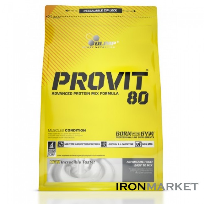 Provit 80 был разработан в качестве дополнения диеты для лиц с повышенными требованиями белков, в том числе спортсменами развивающими силу, силу-выносливость, бодибилдеров, и других видов спорта. Он также может быть использован в качестве пищевого продукта для выздоравливающих. Олимп Provit 80 содержит в сухой массе ок. 90% легкоусвояемых сои, сыворотки, яичного белка и богат эндо-и экзогенными аминокислотами, в том числе и надлежащим образом количественную пропорциональность разветвленных аминокислот. Продукт содержит также гидролизованный сывороточный протеин обеспечивающий доставку полипептидов, пептидов и свободных аминокислот, способствуя поддержанию нормального баланса азота в организме. Кроме того, продукт содержит метаболические активаторы такие как карнитин и холин и инозин освобожденный из лецитина. Продукт дополнен витаминами и минералами, микроэлементами, в том числе такими, как хром, молибден, обеспечивающими нормальный ход метаболических процессов при энергичных физических упражнениях и повышенном потреблении белков.