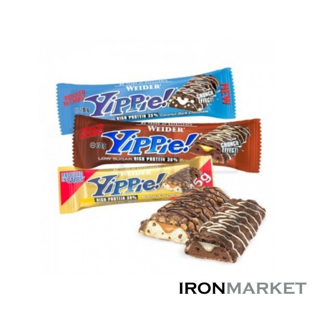 Weider Yippie Bar — протеиновый батончик с высоким содержанием белка от всемирно известного бренда спортивного питания. Отличительная черта этого снека — минимум сахара без потери вкусовых качеств. Теперь даже жесткая диета не станет помехой, чтобы побаловать себя сладеньким!